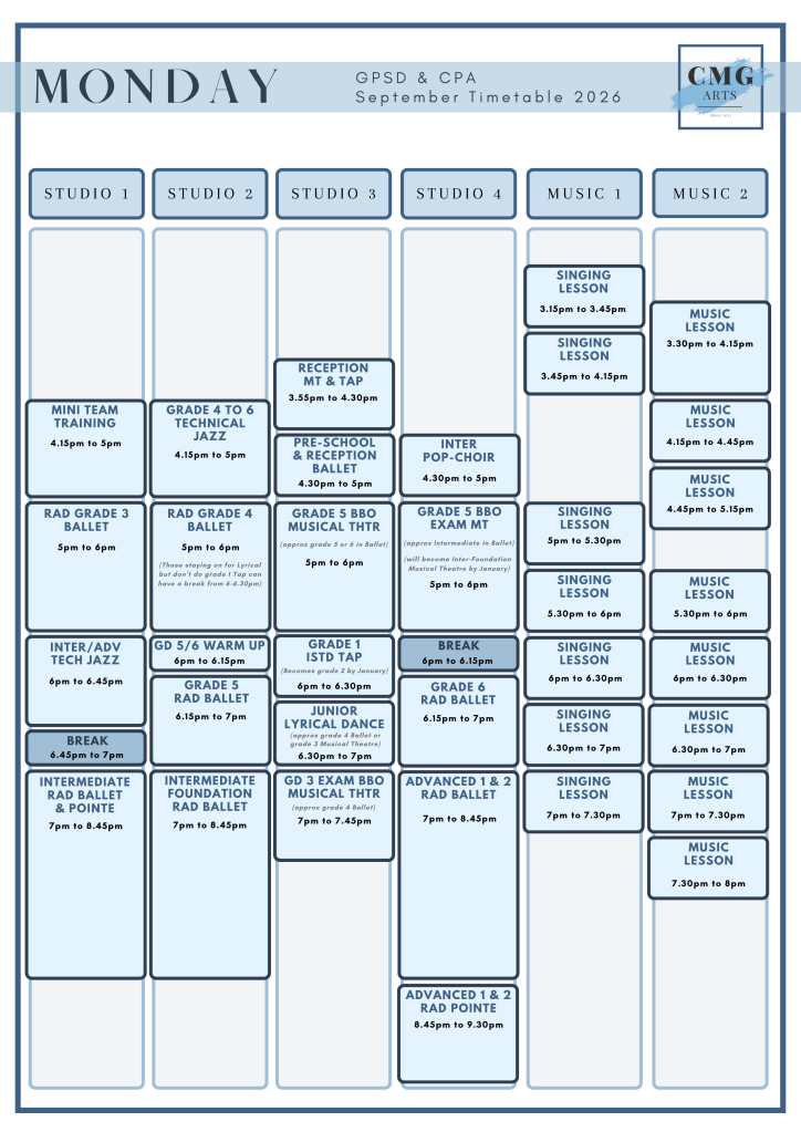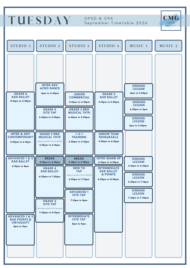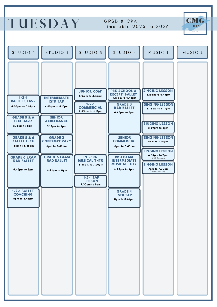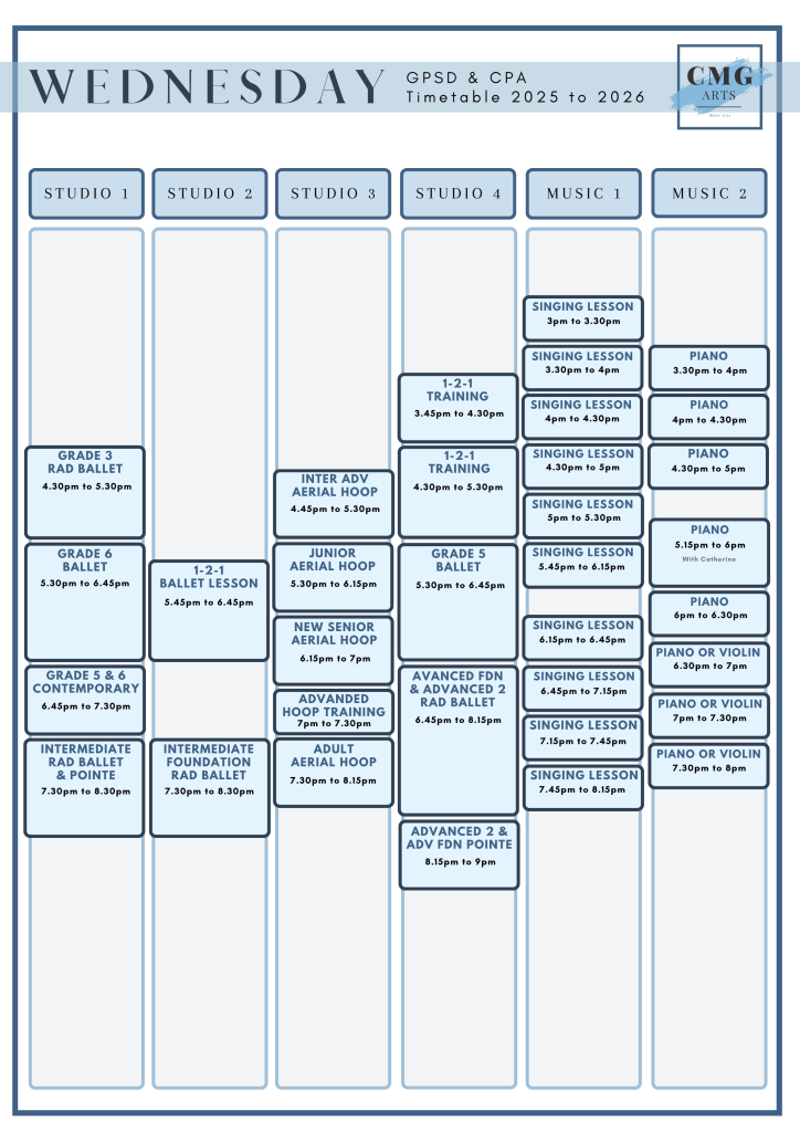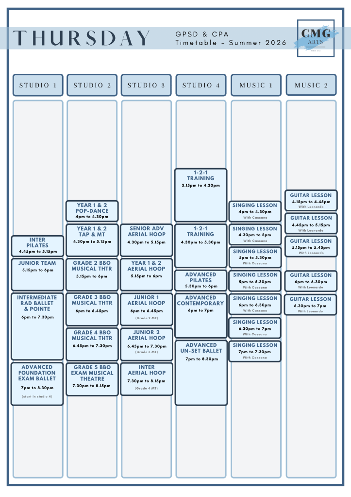 We’re excited to host both Cassana Performance Academy & Georgina Pay School of Dance at our studios. Between the two schools, they offer a wide variety of lessons across the week for students aged 3 upwards. See the full timetable below.