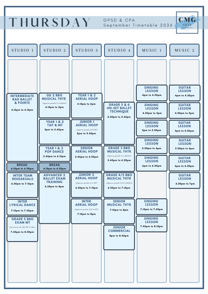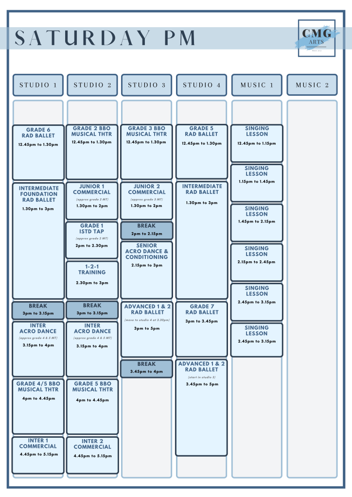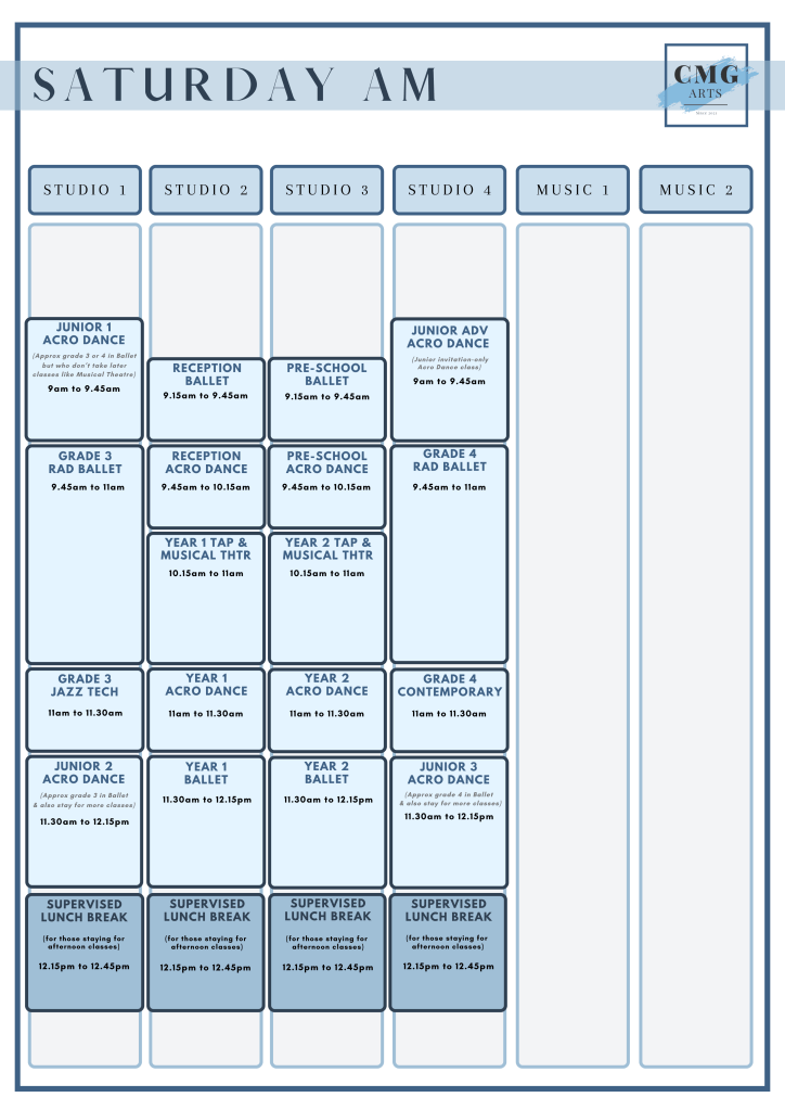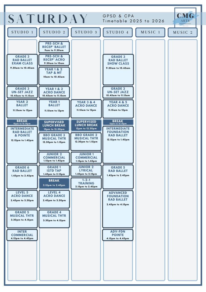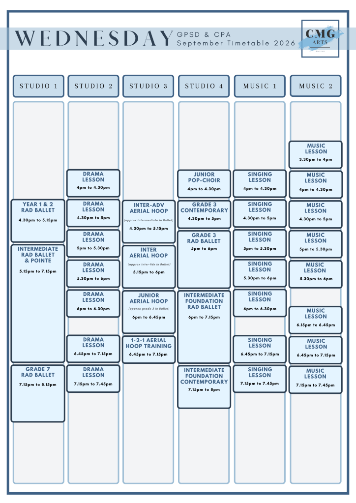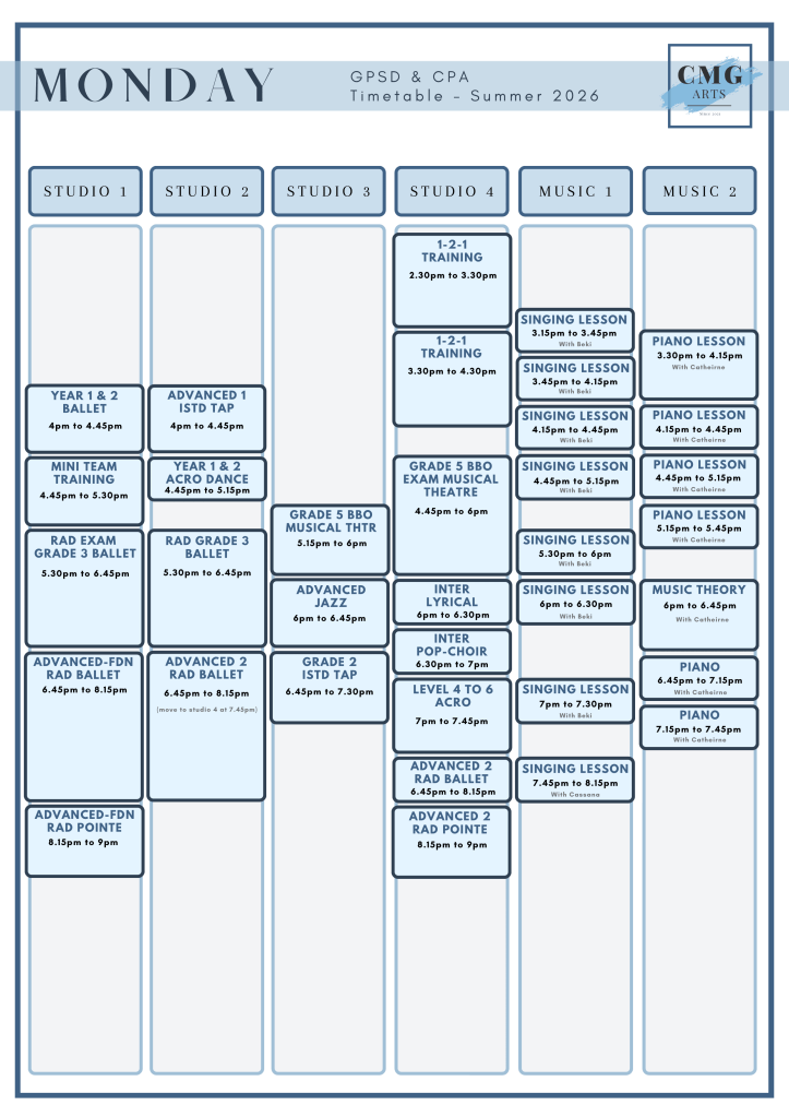 We’re excited to host both Cassana Performance Academy & Georgina Pay School of Dance at our studios. Between the two schools, they offer a wide variety of lessons across the week for students aged 3 upwards. See the full timetable below.